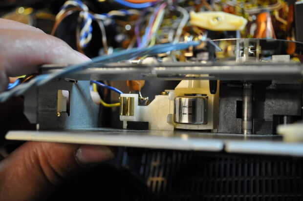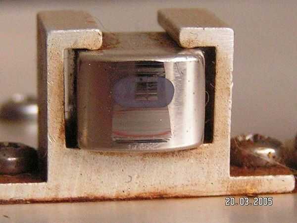 en foto 2 se muestra una cabeza desgastada. Esto no es un cabezal de 8 pistas, pero el concepto es el mismo. ¿Nota cómo el centro del bloque de metal plata parece alguien arena irregularmente? es lo que sucede a cabezas de la máquina de cinta como visten. la superficie de la cabeza debe ser lisa y suave en toda su cara entera. ver foto 3 para lo que parece una cabeza prácticamente nueva.