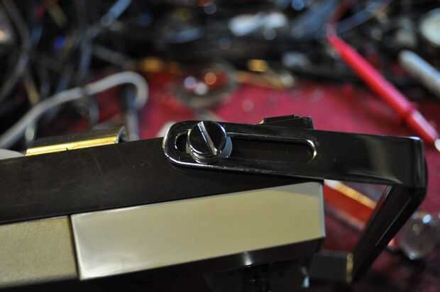 Hay dos tornillos para quitar en el compartimento de las pilas (Foto 1) y dos que contienen el metal de la manija (Foto 2). una vez que los haya, el mecanismo será flojo en su caso. el mecanismo no saldrá a menos que usted quite la perilla de control de joystick que he encontrado ser imposible sin romperlo. Decidí trabajar con el poco espacio que tenía solo con menearse el chasis suelto sobre lo suficiente como para llegar un destornillador y aflojar la placa de retención de la rueda volante (Foto 3).
