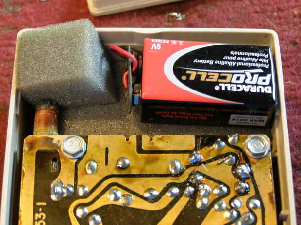 ¿Usted puede haber notado que es un espacio muy grande para una pequeña batería de 9v en esa radio? en mi radio, la batería rebotando es probablemente lo que ayudó a romper la antena que tuve que arreglar. Tomé algunos espuma como lo que ha a componentes electrónicos y una almohadilla para asegurar la batería. que sea suficientemente densas para mantener la batería ajustado cuando la tapa se recorta pero no tan espeso que la contraportada quiere pop off.