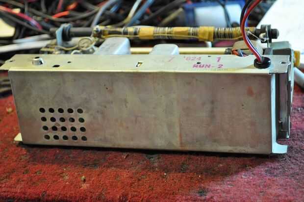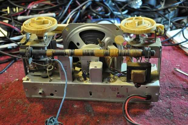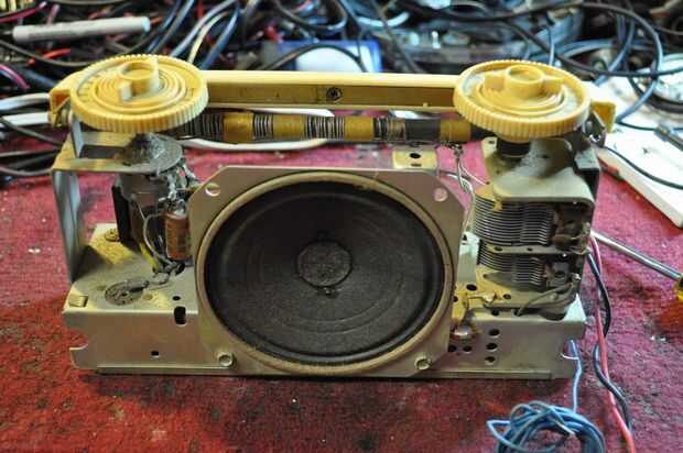 una vez que tengas los dos tornillos hacia fuera, el chasis del radio se saque sólo con perillas y todo. Foto 3 muestra la parte frontal del chasis, Foto 4 muestra la parte posterior del chasis. en este punto, debe tenerse cuidado extra. el altavoz es dañado fácilmente ya que es viejo y frágil. los cables en los transistores son fáciles de doblar y corta hacia fuera.