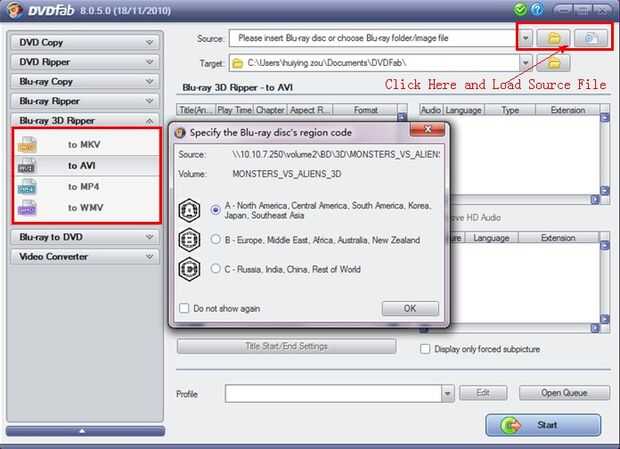 Descargar e instalar Blu-ray 3D Ripper fácilmente, luego ejecutarlo. Hay cuatro opciones disponibles, seleccionar la opción deseada. Luego inserte el disco de Blu-ray 3D o importar fuente Blu-ray de la carpeta o archivo de imagen ISO en el ordenador. Y un pop-up ventana le pedirá que especifique un código de región para la película de la fuente, sólo hacerlo. Unos segundos más tarde, la película de fuente se abrirá.