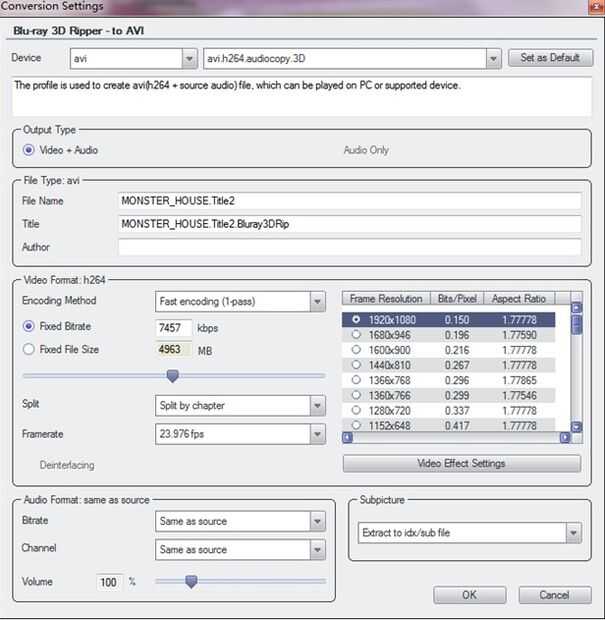 Editar el botón en la interfaz principal le llevará a una ventana de configuración de conversión, usted puede cambiar un montón de parámetros sobre el vídeo y audio, tales como velocidad de bits, tamaño de fotograma, relación de aspecto, volumen, canal, etc.. También puede establecer el título se divida por capítulos y cambiar el nombre de archivo y título