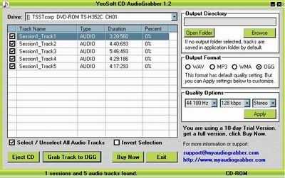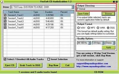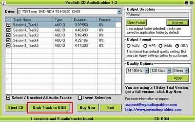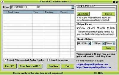psp-ipod-converter.com ( http://www.psp-ipod-converter.com ) YeoSoft CD AudioGrabber es su mejor opción para CD a mp3 wav wma ogg ripper. La interfaz es muy simple y fácil de entender y usar. La conversión es super rápida sin crear ficheros temporales. Puede convertir cada pista en lote uno por uno automáticamente. Con este audiograbber, sólo necesitas 3 pasos para ripear tu CD. Inserte CD en unidad de CD/DVD, seleccione su formato de pista y salida y haga clic en "Agarrar la pista". Usted puede también opciones de calidad audio modificado para requisitos particulares del sistema para la salida de MP3, WMA o OGG, como frecuencia de muestreo, tasa de bits y canales. Y el más reciente formato wma 9.