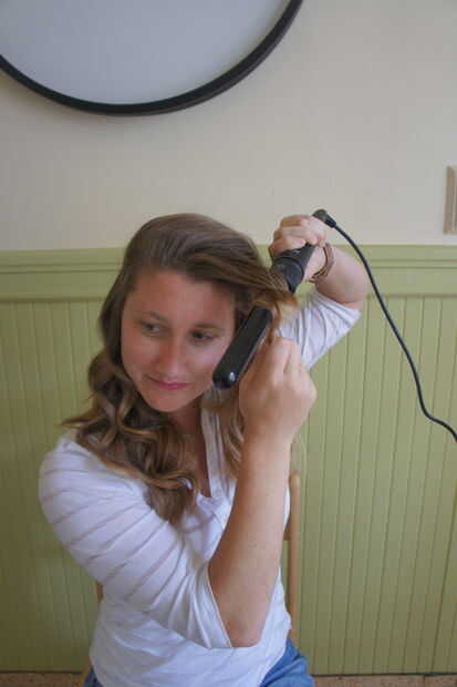 Derribar la última sección y la parte donde quieres que el pelo caiga. Otra vez empezar a tomar pequeñas secciones de un lado y espirales rizos de la cara. Trabajar su camino hacia la parte posterior de la cabeza. Después de que un lado, rizo del otro lado comenzando en la parte delantera y su camino de regreso.
