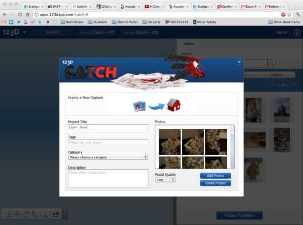 Usando un PC, descargué 123D catch y entonces todas mis imágenes cargados en el software. Esperar pacientemente mientras sus fotos son subidas a su servidor, y renderizar el modelo.