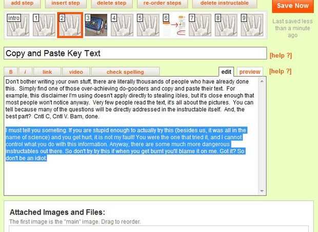 No te molestes en escribir tus propias cosas, hay literalmente miles de personas que ya han hecho esto. Simplemente uno de esos demasiado logro bienhechores y copia y pegar su texto. Por ejemplo, este aviso que estoy usando no se aplica directamente a robar ibles, pero es lo suficientemente cerca como para que mucha gente no lo notará de todas formas. Muy poca gente lee el texto, se trata de las imágenes. Se puede saber ya que muchas de las preguntas que se te ejecuta a través de comentarios directamente trataron en el instructable. ¿Y la mejor parte? CNTL C, Cntl V. Bam, hace. Emeril incluso sería celoso.