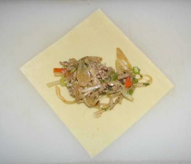 Aproximadamente un 2 a 3 cucharadas de la mezcla en el centro del rodillo de huevo sólo un poco al sur de la línea entre las esquinas 2 y 3, utilizando el dedo o cepillo pequeño para difundir parte de la mezcla de huevo en los bordes de las esquinas 2 a 1 y de 1 a 3