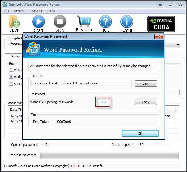 Contraseña agrietada en el menor tiempo y muestra para usted. Luego sólo tienes que copiar y pegar la contraseña para abrir el documento de Word protegido con contraseña.