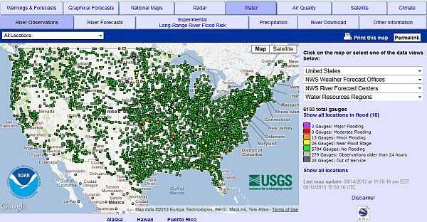 Usted verá un mapa de los Estados Unidos con puntos de colores diferentes (no haga clic en cualquiera de ellos). A la derecha, verás el número de ubicaciones experimentando condiciones de inundación. Se puede saber de un vistazo si su zona está en peligro de inundación, pero vamos a ver mucho más información local en los siguientes pasos.