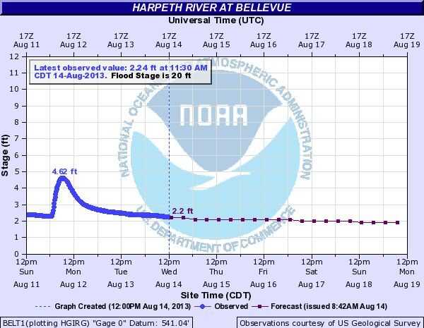 Cualquier cosa a la izquierda de la línea vertical en el pasado y denota por una línea azul gruesa. Cualquier cosa a la derecha de la línea en el futuro y denota por una línea discontinua. Los niveles del río de línea discontinua son previsiones y están sujetas a cambios.