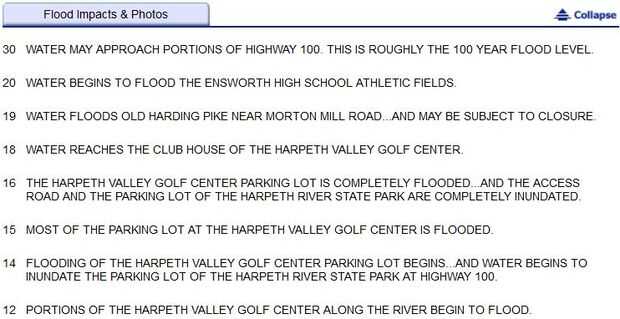 La columna de la izquierda es la serie de etapas de río en pies. En el último paso, nos enteramos que 14 pies es la etapa de acción en este ejemplo. La columna de la derecha indica que las inundaciones en cada nivel. La tabla me dice inundaciones Hwy. 100 temprano. Sé que hay sólo dos arterias principales fuera de mi barrio, así que una vez Hwy. 100 se inunda, tengo que tomar Hwy. 70. Eso es información vital. Hwy. 100 ahora tiene un puente el nombre de dos residentes en el barrio de la última inundación.