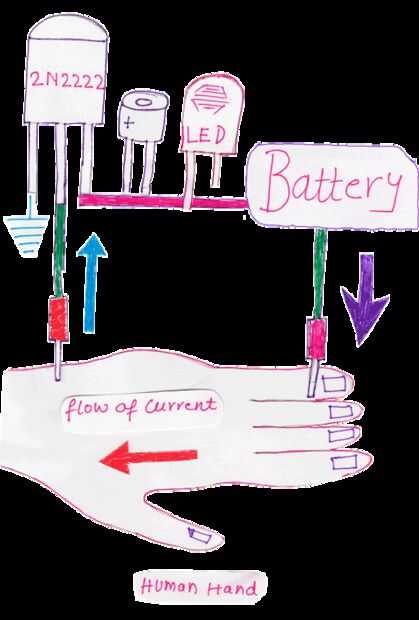 La sonda de entrada ofrece la pequeña corriente que fluye entonces a través de la mano y luego recogidos por la sonda de salida. Si hay flujo de corriente a través del cuerpo, la señal de salida será registrada por el dispositivo y se convirtió en LED y zumbador.