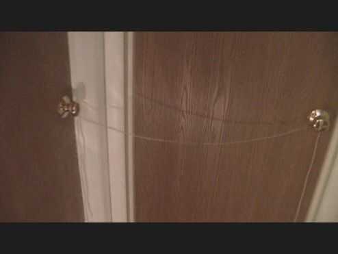 Asegúrese de que hay al menos una persona en cada habitación. Mientras que sus puertas están cerradas, atar un extremo de la cuerda o la cuerda a una perilla de la puerta y el otro extremo para el otro pomo. Deja sobre una o dos pulgadas de holgura... lo suficiente como para permitir que ambas puertas se abran un poco.