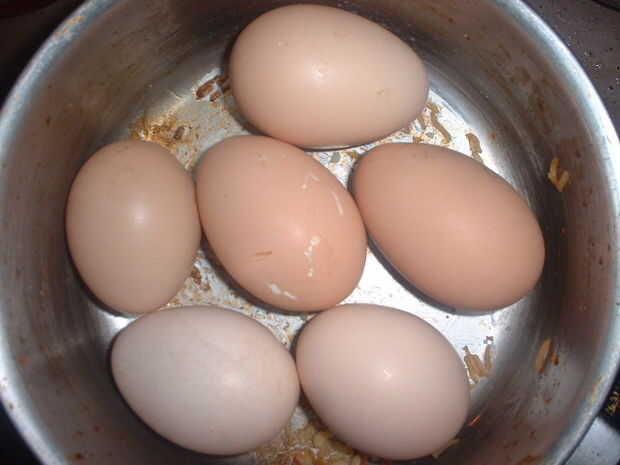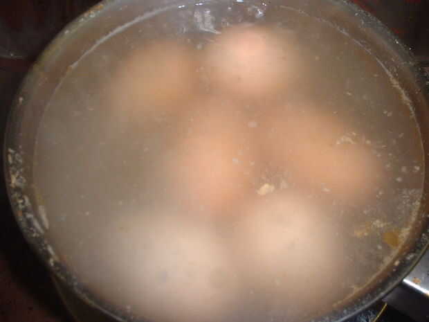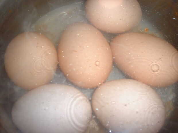 Huevos pequeños fueron colocados cuidadosamente en una olla, agua blanda (a unos 1000 pies sobre el nivel del mar hierve bajo 100oC) se hierve y vierte en la cacerola. Los huevos se hierven suavemente durante ~ 8 min, el agua quitados y los huevos calientes reemplazados en el cuadro que se enfríe.