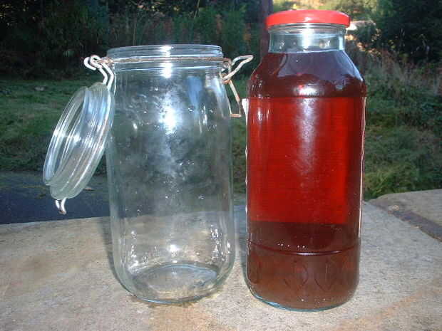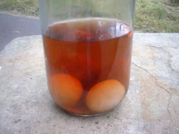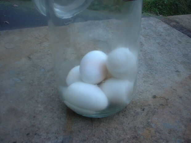 Mientras tanto los huevos fríos fueron pelados y añadidos a un frasco de vidrio limpio. El vinagre hirviendo caliente se vierte sobre los huevos, con cuidado para evitar los gases caliente lo mejor posible prácticamente.