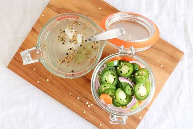 Este método resulta en pickles ligeramente más firmes que la receta original. Si te gusta que sean suaves, siga el método en la receta original calentando el líquido de conserva en vinagre en una cacerola hasta que hierva, luego agregue los jalapeños, zanahorias y cebollas y cocinar por un minuto antes de quitarse el calor. Luego que necesitará para sacar las verduras del líquido, embalamos en la jarra y vierta el líquido sobre.