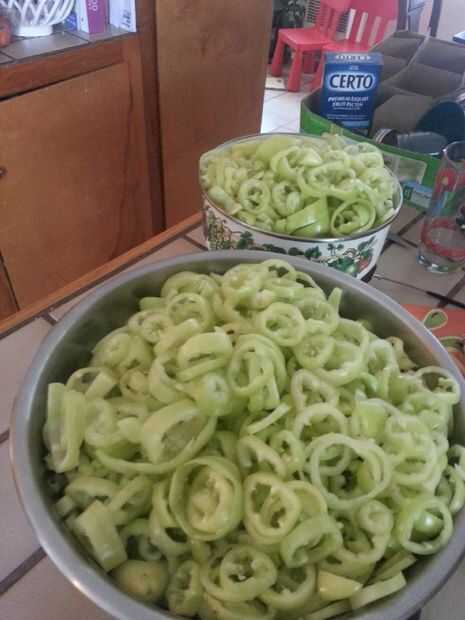 Mientras que la salmuera es salmuera cortar todos tus pimientos en aproximadamente 1/8" de espesor.  Estos embalar firmemente, así que no te preocupes si se rompe un poco.