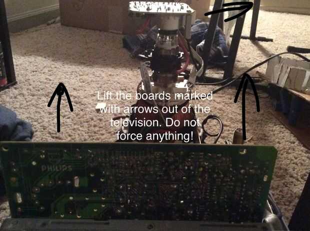 Este paso es bastante simple: Tire de la placa principal fuera de la televisión. En algunos casos la Junta se montará sin tornillos. Si tienes una televisión como esta, sólo tire de la Junta. Si está roscada en el caso, saque los tornillos y extraer la placa de circuito luego. RECUERDE USAR GUANTES, SOBRE TODO EN ESTE PASO! A continuación, suelte la pequeña tablita en la parte superior del arma de electrón. Usted notará en mis fotos que la placa, que vino en el cuello de mi tubo es todavía. Esto es porque el mio no sale, y si el tuyo es como este no lo fuerce más de. Por el contrario, dejarlo para evitar fracturar el tubo. Este tablero se encajará típicamente en y fuera del tubo a través de un conector.