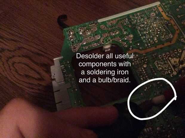 Ahora que han pasado el problema de desarmar a la televisión, ahora es tiempo para extraer los componentes útiles. Para ello necesita un soldador, así como una bombilla/trenza de desoldar. La primera cosa que preocuparse debe ser el transformador flyback. Usted sólo puede la antorcha si tiene un soplete, pero si usted no tomará algún esfuerzo. Tuve que hacerlo sin una antorcha y funcionó bien (después de alrededor de treinta minutos de succionar soldadura y tracción). A continuación se puede sólo desoldar el resto de los componentes normalmente. Tal vez es mejor usar un par de alicates para extraer los componentes para evitar la quema de las manos. La televisión debe generar un montón de resistencias, transistores, transformadores, condensadores y diodos para dure mucho tiempo. Luego usted puede deshacerse de la Junta. Para deshacerse de la CRT, ir a un centro de residuos maneagement. NO SOLO CHUCK LO EN EL CONTENEDOR DE BASURA!