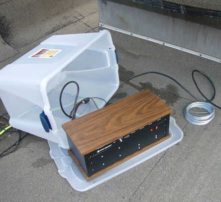 Para proteger nuestro transmisor del tiempo y la lluvia, compró un recipiente tupperware enormes y reequiparse con los agujeros para la ventilación y el cable funciona albergar y proteger los componentes eléctricos delicados.