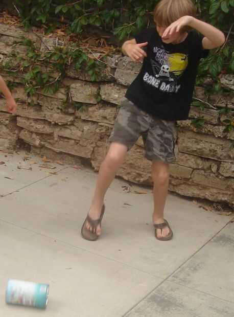 Que los niños comienzan con algunos "la puede patear". Los niños sólo pueden patear la lata de café y verlo rodar. Tuvimos que patear las carreras donde los niños tuvieron que patear la lata de un lado del patio al otro. Primero uno para hacerlo al otro lado y de nuevo ganó.