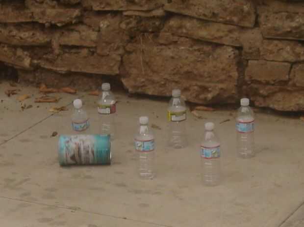 1. de pie seis recipientes vacíos en una configuración de bolos de su elección. Se utilizaron seis pequeñas vacías botellas de agua que hemos eliminado de la papelera de reciclaje. Comenzamos con un pin de bolos tradicional creado, pero encontró que era demasiado difícil, así que sabio BFF mi hijo ocurrió con la configuración que veis en la foto. Trabajó muy bien.
