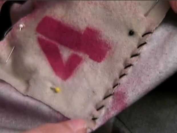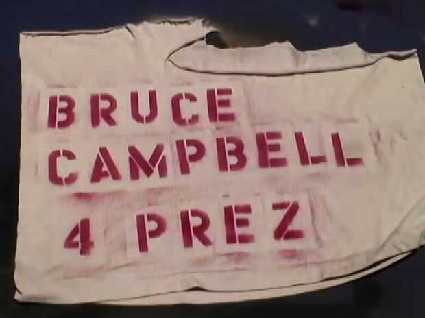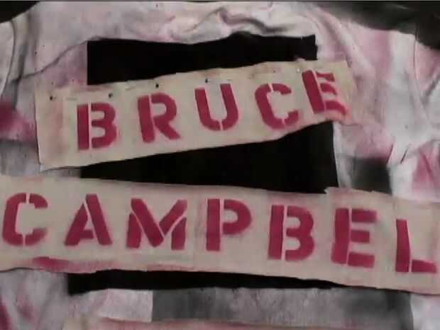 a continuación, tome una camiseta vieja y usando las plantillas que se pueden conseguir en una ferretería por alrededor de dos dólares, pintura de aerosol a sí mismo una frase cool. Elegimos "Bruce Campbell 4 Prez"! Recortar las palabras pin a su camisa y coser en! Nos gusta esta puntada diagonal, porque da un aspecto cool punk rock!