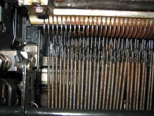 Foto 2 muestra el área donde clave el pivote de las palancas cuando se presiona una tecla. El problema que causa la A, Q y 2 llaves para no trabajar en esta máquina de escribir especial fue debido a la oxidación en este pivote. Estas tres teclas derecha juntos fueron (las tres palancas a la izquierda en la foto), y sospecho que alguien había derramado un refresco o un café en esta zona.