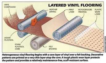 Para apoyar este núcleo de vinilo, se enlaza a una 25 mil felpa que está hecho de componentes fibrosos utilizados en la industria de fabricación de papel, piedra caliza y arcilla, todo llevado a cabo junto con una carpeta plástica. A continuación, el patrón decorativo se imprime una capa de vinilo muy fino que cubre la capa de la base. Por supuesto, sin protección, esta fina capa impresa pronto desaparecería a través de la abrasión normal. Para resolver el problema, fabricantes agregar una capa superior de vinilo que es cerca de 10 milésimas de espesor. Cuando se seca, esta capa de PVC transparente, llamada la capa de desgaste, protege el patrón impreso y también proporciona una superficie relativamente libre de mantenimiento que no requiere encerado.