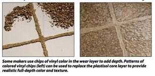 Desde un punto de vista visual, borde de suelo de vinilo sobre cualquier otro material es que puede ser hecho para parecer casi cualquier otro material. Una de las claves de esto es la tecnología de la impresión. Impresión del rotograbado es un proceso rotatorio que utiliza placas fotograbadas para reproducir imágenes realistas debajo de la capa de desgaste de la hoja compuesta. Imágenes de piedra, teja y ladrillo, texturas de mampostería y madera se utilizan para producir revestimientos sorprendentemente realista. Para aumentar la sensación de profundidad visual, algunos fabricantes de añadir color a la capa de capa de desgaste, color que se extiende la profundidad de la capa para no desgastar. Armstrong pavimentos ha desarrollado un producto, llamado incrustaciones de Color, que reemplaza la capa impresa con una capa de la base que tiene patrones y colores de fondo. Además de diseños e imágenes, técnicas de grabación en relieve agregar textura realista a la superficie. En general se puede impartir textura a una película de vinilo por manipular el proceso de secado. Mecánico de grabación en relieve puede mejorar un patrón plano de ladrillo o piedra con un three - dimensional calidad verdadera.