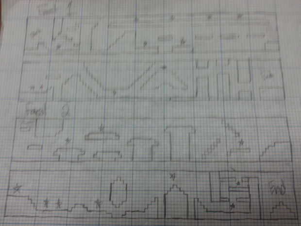 Después de terminar el personaje principal, he dejado gran parte de la spriting y casi la totalidad del diseño de niveles hasta mi pareja, Devon. Ya que Devon quiere entrar en diseño del juego profesionalmente cuando se pone más viejo, pensé que sería buena práctica para le diseño de los niveles y en general crear una mejor experiencia para el jugador que yo sabía que no podía rápidamente llamo divertidos y desafiantes niveles. Para casi todos los niveles, Devon primero dibujó en papel cuadriculado en su totalidad para tener una idea de cómo funcionaría y hacer cambios con facilidad. Todo el juego debía basarse en una resolución de 1280 x 720, por lo que trabajamos alrededor de cada caja aproximadamente 100 x 100 píxeles y el jugador verá solo aproximadamente 13 cajas horizontalmente y 7 cajas verticalmente a la vez. Usando su conocimiento de diseño de niveles en plataformas populares, Devon intentó crear niveles interesantes y desafiantes sin ser demasiado duro y no divertido. Los niveles fueron construidos alrededor de altura de salto propuesto del personaje principal, que diseño un poco más difícil ya que no queremos el reproductor para poder saltar más alto que alrededor de un tercio de la altura de la pantalla. Sin embargo, los niveles fueron alterados para ser más gratificante debido a esto y realmente pudimos exprimir en frío unas nuevas secciones.