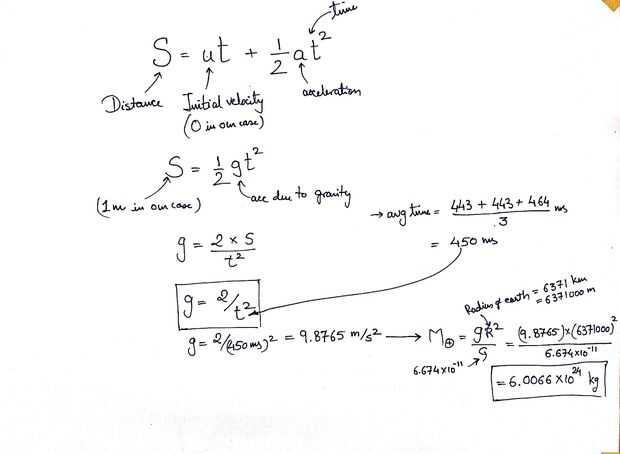 Finalmente sustituyendo este valor de 'g' para obtener la masa de la tierra tenemos que estar cerca de 6.0066 x 1024 Kg, como se puede ver en la imagen adjunta.