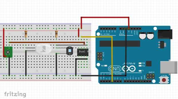 Este circuito se utilizará a la hora de la hora de inicio de la caída libre de un objeto utilizado para medir la 'g'. Aquí están los puntos importantes acerca de la imagen esquemática de fritzing.