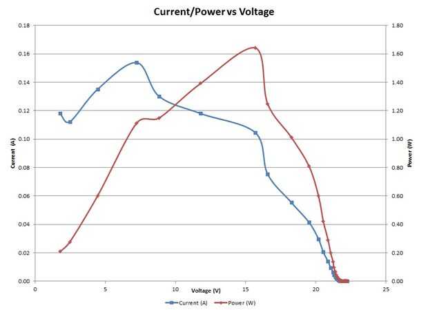 De vez en cuando, voy a añadir la corriente en el gráfico del voltaje de la energía. Mientras que esto no es crítico en la mayoría de los casos, en algún momento producen algunas ideas útiles. Por ejemplo, en el gráfico anterior podemos ver que existe un clúster de puntos de datos en el extremo de alta tensión. Como este es donde cae la corriente, sugiere que estos representan valores de alta resistencia a la carga. Para mejorar la resolución en la zona de potencia máxima, podemos calcular qué gama de resistencias adicionales sería necesario. Veo un punto en (sobre) 16 voltios V y 105 ma. Sugiere una resistencia de sobre (16V/.105A) de 150 ohmios. Nuestra caja de resistencia saltó de 220 ohmios, a 150 ohmios, a 100 ohmios. Una carga de una resistencia variable de 100 ohm en serie con una resistencia de 50 ohm daría mucho mejor resolución para el área que interesa. También tenga en cuenta, que se puede ver en la curva de potencia, que necesita resistencias potencia para leas