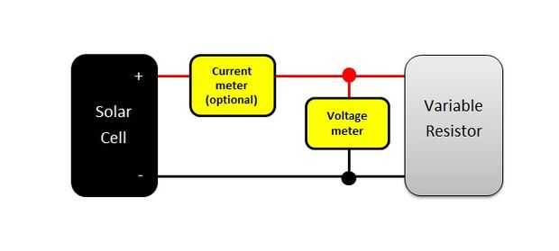 Esto es simplemente una célula solar conectado en paralelo con la carga y un multímetro para medir voltaje. Antes de empezar, asegúrese de que la carga se establece en 'abrir'. Si tienes un multímetro adicional que puede medir la corriente, también se puede conectar en serie con la carga. Esto facilita las cosas un poco, pero no es necesario.