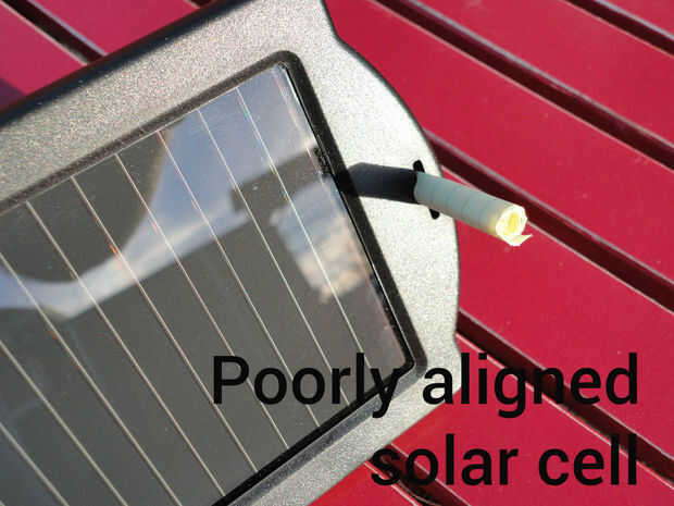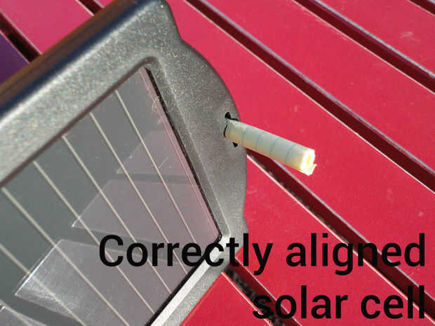 Más allá de utilizar una buena fuente de luz, necesita alinear la célula solar hacia correctamente para conseguir la potencia óptima. Pensar como posicionamiento una vela hacia el viento. La mejor manera que he encontrado para alinear una celda solar hacia el sol para montar un pequeño palo perpendicular a la superficie de la célula solar entonces ajustar la celda para reducir al mínimo la sombra del palo. Cuando la sombra se reduce al mínimo (preferentemente no visible), la célula solar se enfrenta hacia el sol.