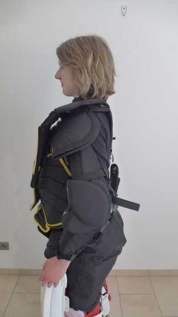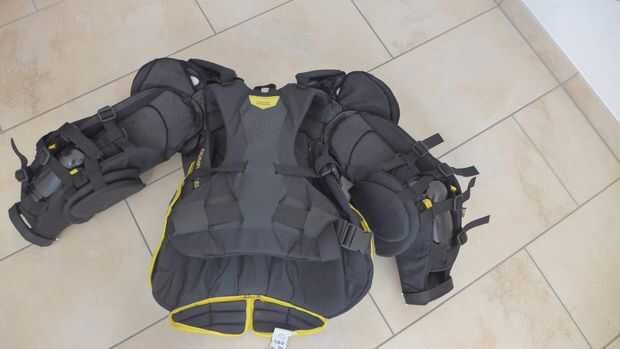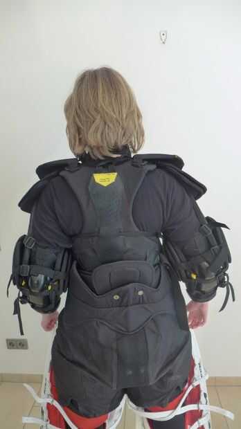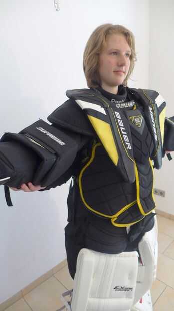 Levante el pecho y los brazos sobre su cabeza y hacia abajo, deslizando la cabeza y los hombros entre la parte delantera y parte trasera de la misma. Después a través de la cabeza y los hombros, deje que la corredera pecho y brazos para cubrir que el resto de su cuerpo superior hasta el pecho y los brazos descansa sobre sus hombros. Entonces puso sus brazos a través de las "mangas" del pecho y los brazos y asegúrese de que sus manos miren hacia el otro lado de las mangas. Si es necesario usted puede ajustar las correas para aflojar o apretar el pecho y los brazos. El pecho y los brazos deben superponerse con los pantalones de hockey ligeramente y debe ser sobre el protector del cuello.