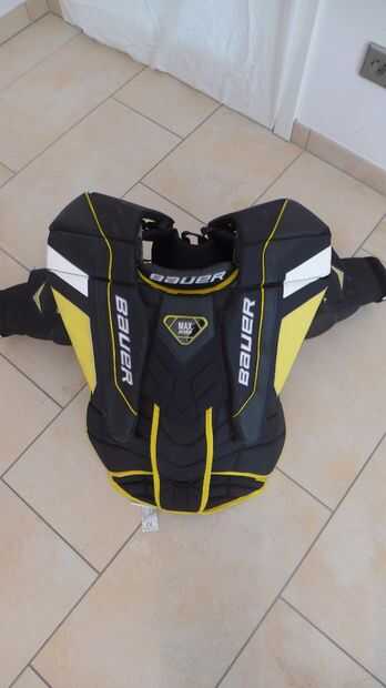 El protector de pecho y brazos ofrece protección para el pecho, brazos y hombros principalmente, pero también protege a la parte de atrás un poco. Es esencial porque no es raro que un portero es golpeado por un duende malicioso, palillo o patinar en la parte superior del cuerpo. Jugadores de hockey tienen partes separadas que funcionan como protección gran parte superior del cuerpo, mientras que el pecho y brazos de un portero es una pieza adjunta.