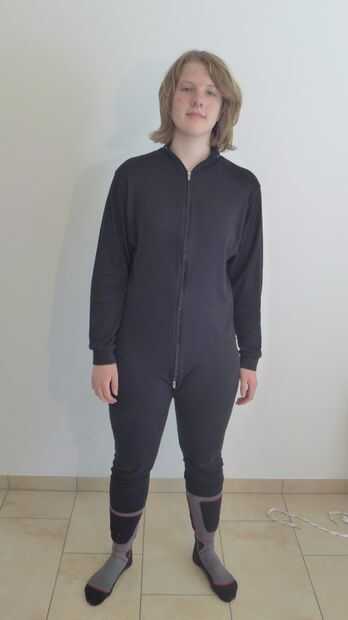 Una parte mono: el mono de una parte se puede poner en por entrar en las "patas" del palo y luego levantando el resto del traje. Después de tirar el traje hasta la cintura, las piernas deben caber en el traje correctamente y puede continuar con sus brazos. Poner los brazos por las mangas como si usted sería poniendo una chaqueta. Después que debe usar el Body con la cremallera en la parte delantera, así que la próxima cremalleras para arriba.
