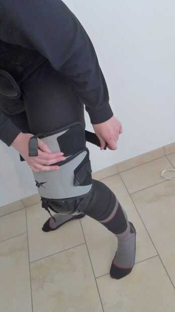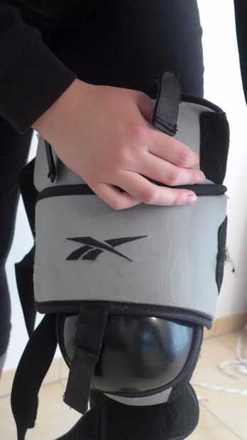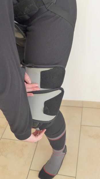 Para poner los protectores de rodilla, abrir las bandas y poner el protector de rodilla en la rodilla mientras estaba sentado con la rodilla en un ángulo de 90° preferentemente. Luego comenzar en la parte superior y sujetar las correas alrededor de su pierna uno tras otro. Después de todas las correas estén apretadas, levantarse y moverse un poco. Durante el movimiento de que los protectores de rodilla no deben deslizarse hacia abajo, de lo contrario Fije las correas aún más estrictos.