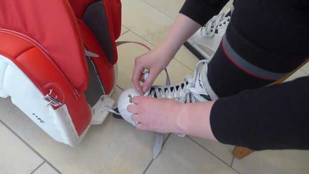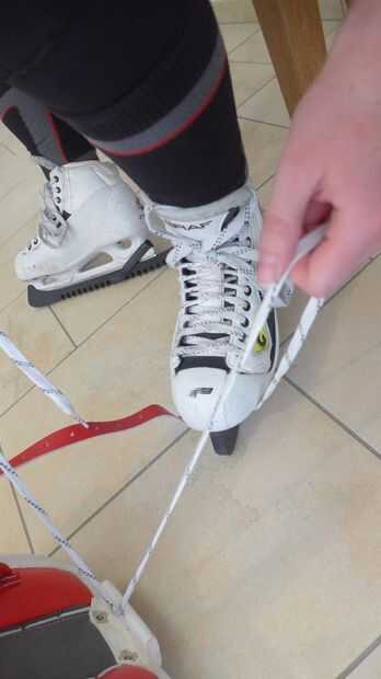 Poner en el skate como un zapato y asegúrese de que esté completamente en la parte posterior de tu skate. Después tu skate es, comenzar a ajustar el patín de la parte inferior a la parte superior de la raya. Algunas personas prefieren los patines más estrictos que otros, por lo que es usted exactamente cómo apretado tu quiere tener tu skate, pero su pie no debe moverse en el skate patinar en hielo o a pie. Prefiero mis patines apretados firmemente hacia arriba, pero algunos porteros dejan el orificio superior del patín libre. Después de tirar la raya apretada, un nudo en la parte superior y asegúrese de que los cordones restantes no se pueden obtener en el camino de la cuchilla. Después de que han puesto en un skate, agarra la otra y repetir el proceso.