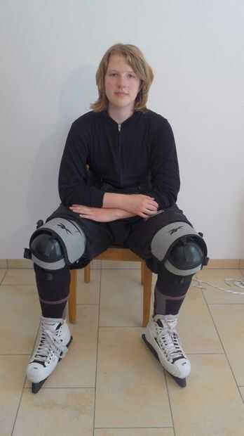 Después de tus patines están en, necesitan que se unirá a los pads de retraso para que aquellos no se tuerza durante el juego. Sentarse en una silla o banco con los pies en el suelo y coloque las almohadillas hacia fuera delante de usted como se muestra en las fotos. Asegúrese de que las pastillas son en la pierna correcta comprobando si la llanta en la cara de la almohadilla está en el exterior. Luego agarrar los cordones en la parte inferior de las almohadillas y sujete a la parte inferior de tus patines como se muestra en el vídeo incluido en el principio de este Instructable. Asegúrese de que estos lazos no se afloje o interferir durante el juego, al igual que los cordones de skate. Hacer esto para ambas almohadillas.