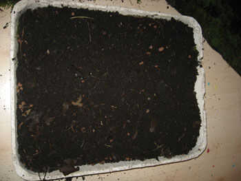 compost en el envase de espuma de poliestireno (compost suelo, granos hidromasajes, suelo de compost)
