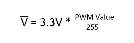 Con esto en mente, somos capaces de crear la ecuación arriba donde el V con la barra de arriba es la tensión media resultante para un valor particular de pwm.