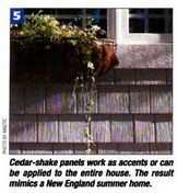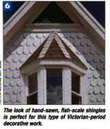 Una desviación más significativa de apartadero de regazo estándar es revestimiento de madera con la mirada de cedro resistido o pintado. Esto se puede utilizar como un acento en gables o como un tratamiento de revestimiento de toda la casa (Foto 5). Y por último, muchos fabricantes ahora ofrecen el aspecto de cortada a mano, tejas de cedro de escama de pez (foto 6). Éstos vienen en paneles de 36 a 64 pulg que convincentemente viejo mundo, si utiliza en un verdadero victoriano Inicio o su contraparte suburbano moderno.