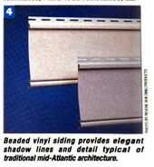 Un ejemplo es moldeado revestimiento (foto 4) hecho por Revere Building Products y Owens Corning. Se basa en un detalle arquitectónico tradicional de mediados de-Atlántico Costa de casas. Otro desarrollo reciente es de color abigarrado en algunos apartaderos premium. Colores de resaltado se logran de dos maneras, dejando caer los granos de pigmento en la extrusora como se hace el revestimiento, o mediante la aplicación de películas casi acrílicos sobre un panel de cedro en relieve erosionado. El resultado es un aspecto muy natural, a diferencia de cualquier cosa disponible antes.