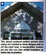 Los fabricantes ofrecen una gama de alternativas de rosetas de esquina de estilo victoriano acentuar 31⁄2 pulg. de ancho canal ajuste de moldura clásica (Foto 8). Y muchos de estos trimpieces están disponibles en colores claros y oscuros de diseñador. Por último, puede tener un frontón decorativo sunburst, en colores sólidos o alternados. Sunburst decorativo es caro, sin embargo. Cada pieza debe ser medida corte y pop-clavada a la pieza contigua, por lo que es un trabajo todo el día cuesta alrededor de $1000 (Foto 9).
