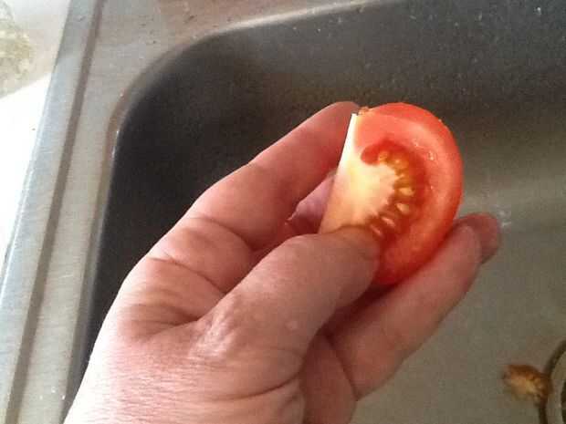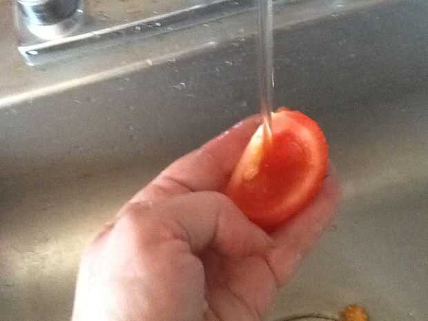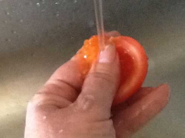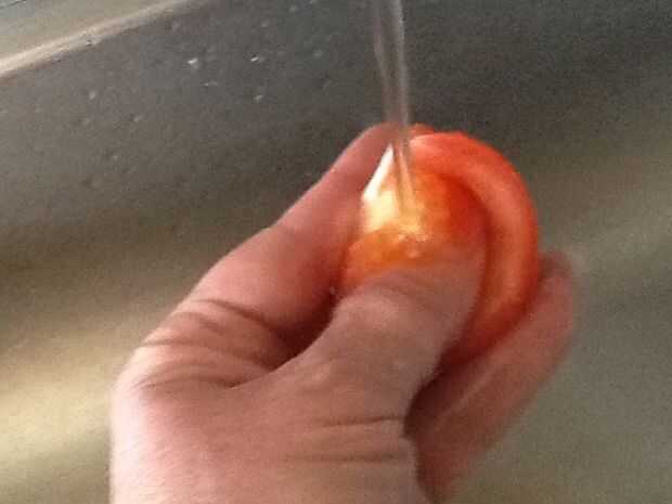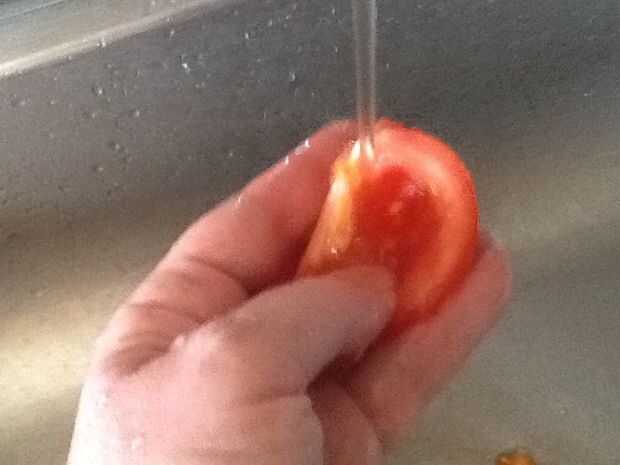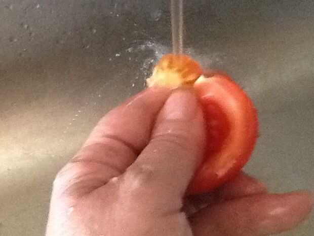 Mantener un cuarto con agua fría (o puede utilizar un recipiente de agua fría pero tardará más tiempo para asegurarse de que todas las semillas están hacia fuera) y usar el pulgar se deslice bajo la masa de semilla y levante lo suficiente como para pellizcar apagado. Ejecute su pulgar a través de la cavidad para asegurarse no hay callejeros semillas.