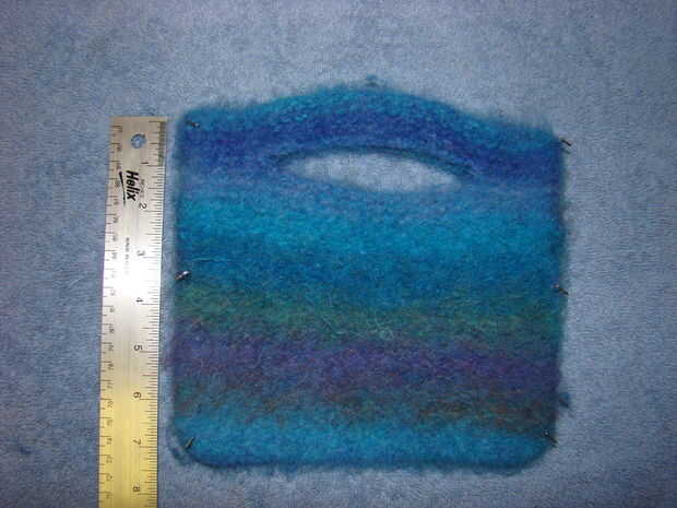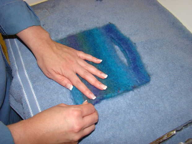 Poner la pieza sobre una toalla y estirar o tirar de la pieza en posición. Puede utilizar alfileres para mantener la pieza en su lugar durante el proceso de secado si quieres.