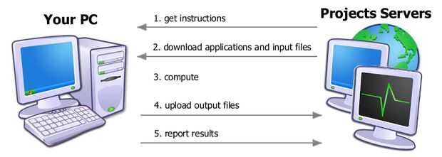 Una vez que las instrucciones y los datos han sido descargados, ordenador funciona a través de él hasta que termine y luego subirá los resultados hacia el originador del proyecto (ver segunda imagen).